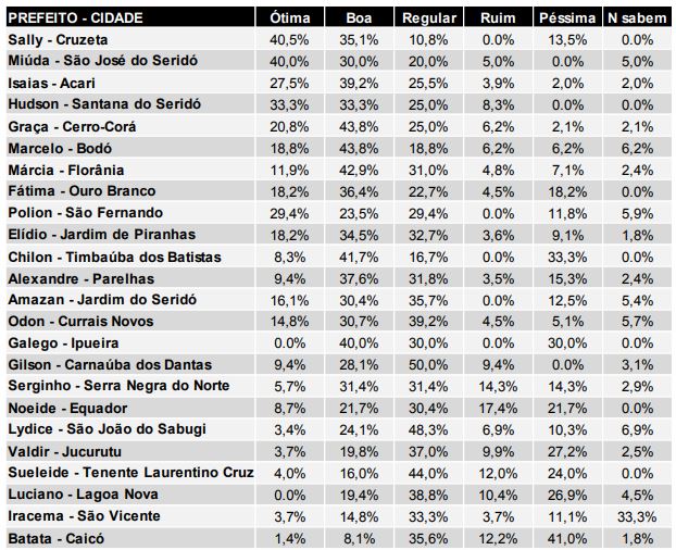 A pior avaliação ficou com a administração do prefeito de Caicó, Batata Araújo (PSDB), que somou um índice positivo de 9,5%.