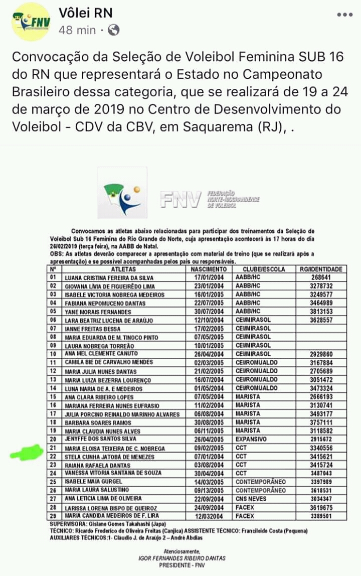 Maria Eloisa Teixeira de C. Nóbrega, a Helô, tem 14 anos e já disputa as categorias adultas do vôlei feminino, representando Jardim do Seridó. A jovem conta com o apoio exclusivo do DS Contabilidade. Agora, ela foi convocada para a Seleção de Voleibol Feminina Sub 16 do Rio Grande do Norte.