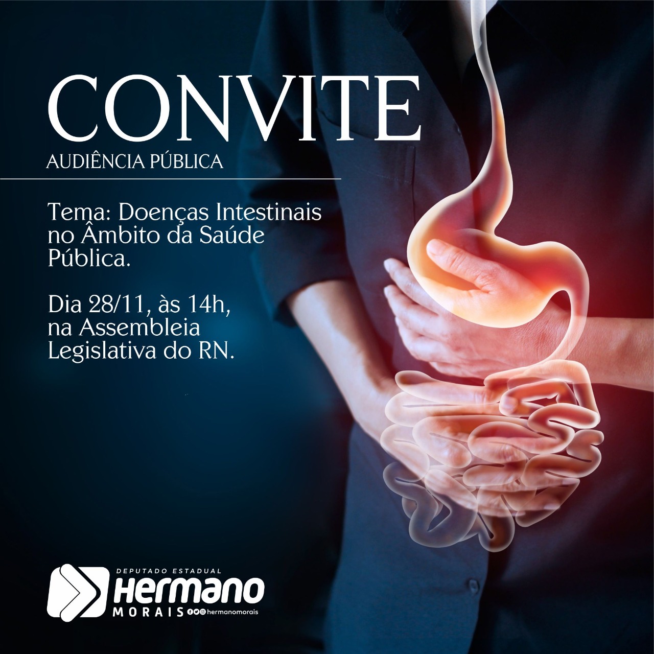 A Assembleia Legislativa do Rio Grande do Norte sediará na quinta-feira (28), às 14h, uma audiência pública para tratar sobre as Doenças Inflamatórias Intestinais no âmbito da saúde pública do estado. De propositura do Deputado Hermano Morais, o objetivo do encontro é trazer visibilidade para a causa: discutir medidas que possam auxiliar o tratamento e conscientizar a população sobre essas doenças.