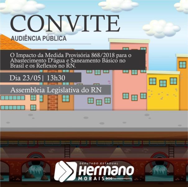 No intuito de discutir o “O Impacto da Medida Provisória 868/2018 para o Abastecimento D’água e Saneamento Básico no Brasil e os Reflexos no RN”, a Assembleia Legislativa do RN sedia audiência pública na próxima quinta-feira (23), às 13h30. Atendendo solicitação de entidades do Setor de Saneamento no Brasil e da sociedade civil organizada, o Deputado Hermano Morais propõe debate sobre o tema – o objetivo é entender o cenário da atual conjuntura e buscar soluções que atendam aos anseios da coletividade.