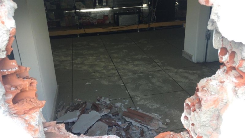 Para entrar na farmácia, os bandidos foram a um terreno baldio que fica por trás do prédio e fizeram um buraco na parede dos fundos do estabelecimento.