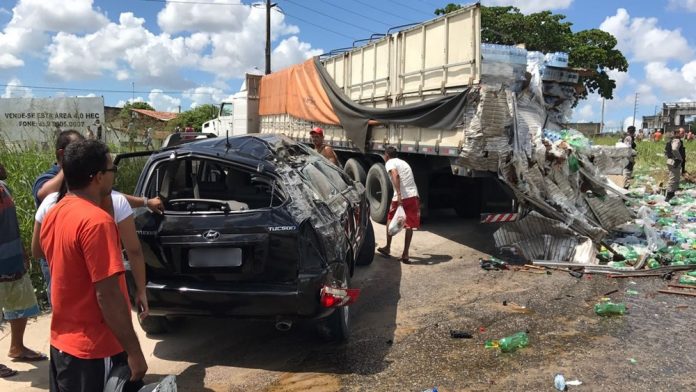 Um acidente envolvendo dois caminhões e uma caminhonete Hyundai Tucson foi registrado na manhã desta sexta-feira (19) na BR-230, no sentido Bayeux para João Pessoa, na região metropolitana da capital paraibana. Na colisão, a carga de um dos caminhões caiu no canteiro central, ficou espalhada e os moradores da área saquearam a carga.