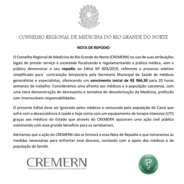 Conselho de medicina repudia edital da prefeitura de Caicó para contratação de médicos