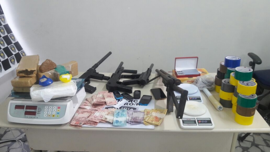 Na casa onde os mesmos estavam, foi encontrado 01 quilo e 100 gramas de cocaína pura em pedra, cerca de 3,5kg de maconha em tabletes, 50g de crack, 06 aparelhos de celulares, 03 balanças de precisão para pesar a droga, 04 escopetas calibre 12 de fabricação caseira, 01 veículo pálio e 01 motocicleta.