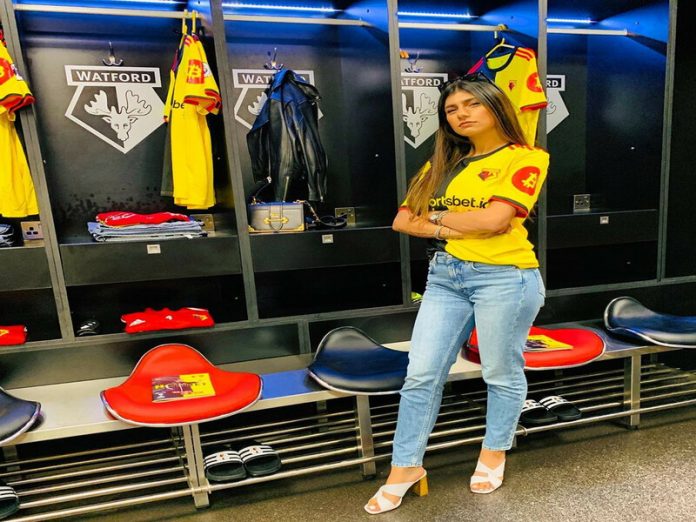 Na outra postagem, dentro do vestiário, a jovem de 26 anos estava curtindo o convite especial do clube dos colaboradores do time inglês, no estádio Vicarage Road Stadium.