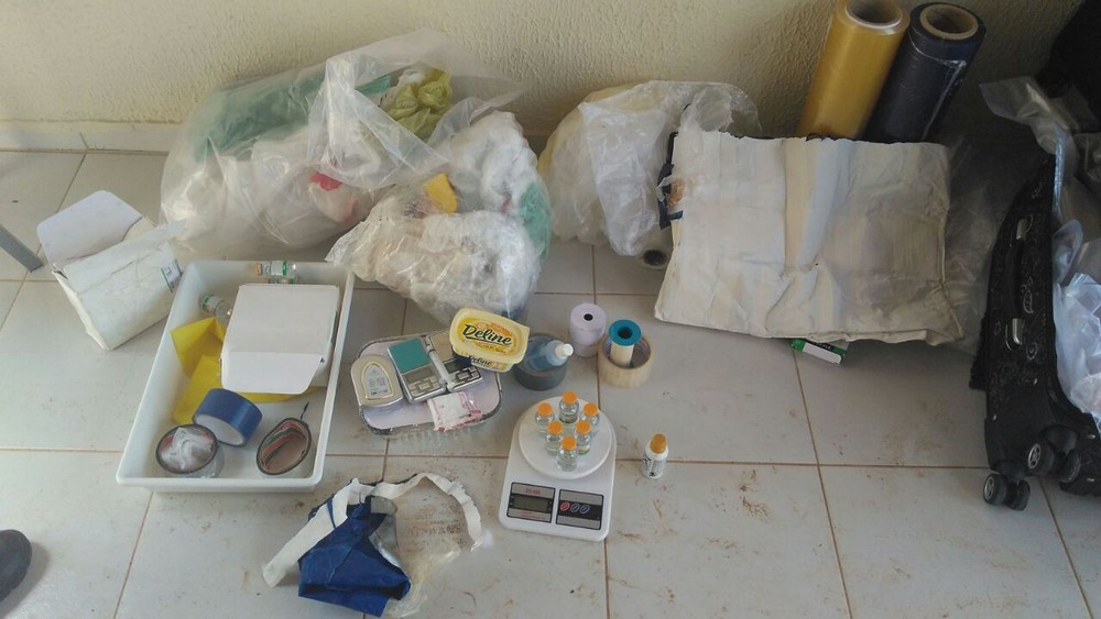 Na casa foram encontrados um liquidicador industrial, uma prensa mecânica, três malas de viagem com fundo falso e quatro cintas que, segundo a polícia, seriam utilizadas para transportar drogas,