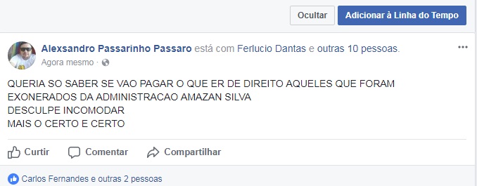 Não aguentando esta situação, um dos exonerados postou em uma de suas redes sociais uma publicação mostrando toda a sua indignação de como estão sendo tratados pelo prefeito Amazan Silva.