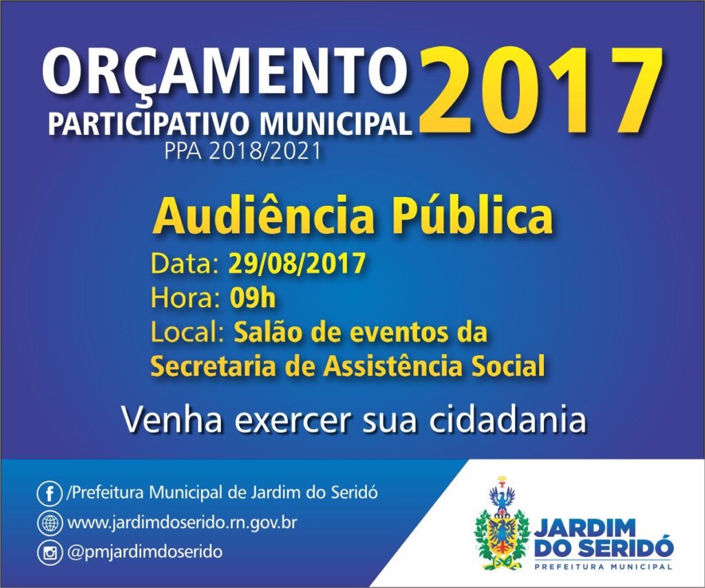 A Prefeitura de Jardim do Seridó realizará na próxima terça-feira, 29 de agosto, às 09h00, no salão de eventos da Secretaria de Assistência Social, uma Audiência Pública Municipal para tratar sobre a Lei Orçamentária Anual, referente ao exercício de 2018 e ao Plano Plurianual (PPA), que é o plano orçamentário do município.