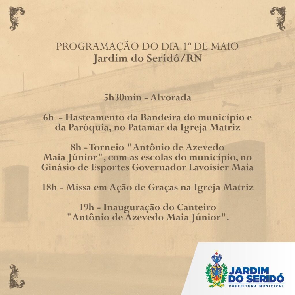 O município de Jardim do Seridó, por meio do seu Prefeito Amazan, convida à todos para a programação do dia 1º de maio (Dia do Trabalho) e dia alusivo aos 200 anos do falecimento de Antônio de Azevedo Maia Júnior, fundador de Jardim do Seridó, antiga Conceição do Azevedo.