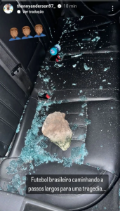 Pelas redes sociais, o meia Thonny Anderson falou que seu filho, de dois anos, quase ia sendo atingido. “Jogaram pedra a 5 metros do meu filho de apenas 2 anos de idade. Se essa pedra pega na cabeça dele, provavelmente não ia escutar mais a voz dele me chamando de papai. Mas, graças a Deus, ninguém foi atingido”, lamentou Thonny.