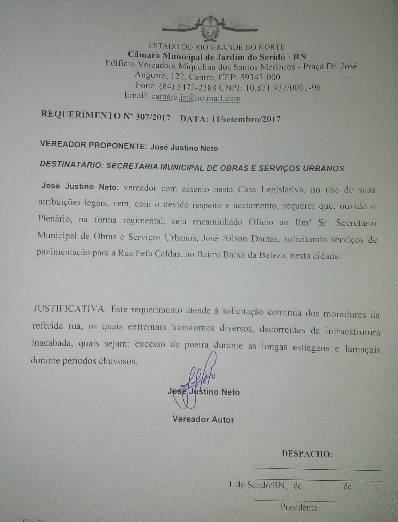 O vereador José Justino Neto (PMDB), apresentou no Plenário da Câmara Municipal, UM requerimento. Para a Secretaria Municipal de Obras e Serviços Urbanos em Jardim do Seridó.